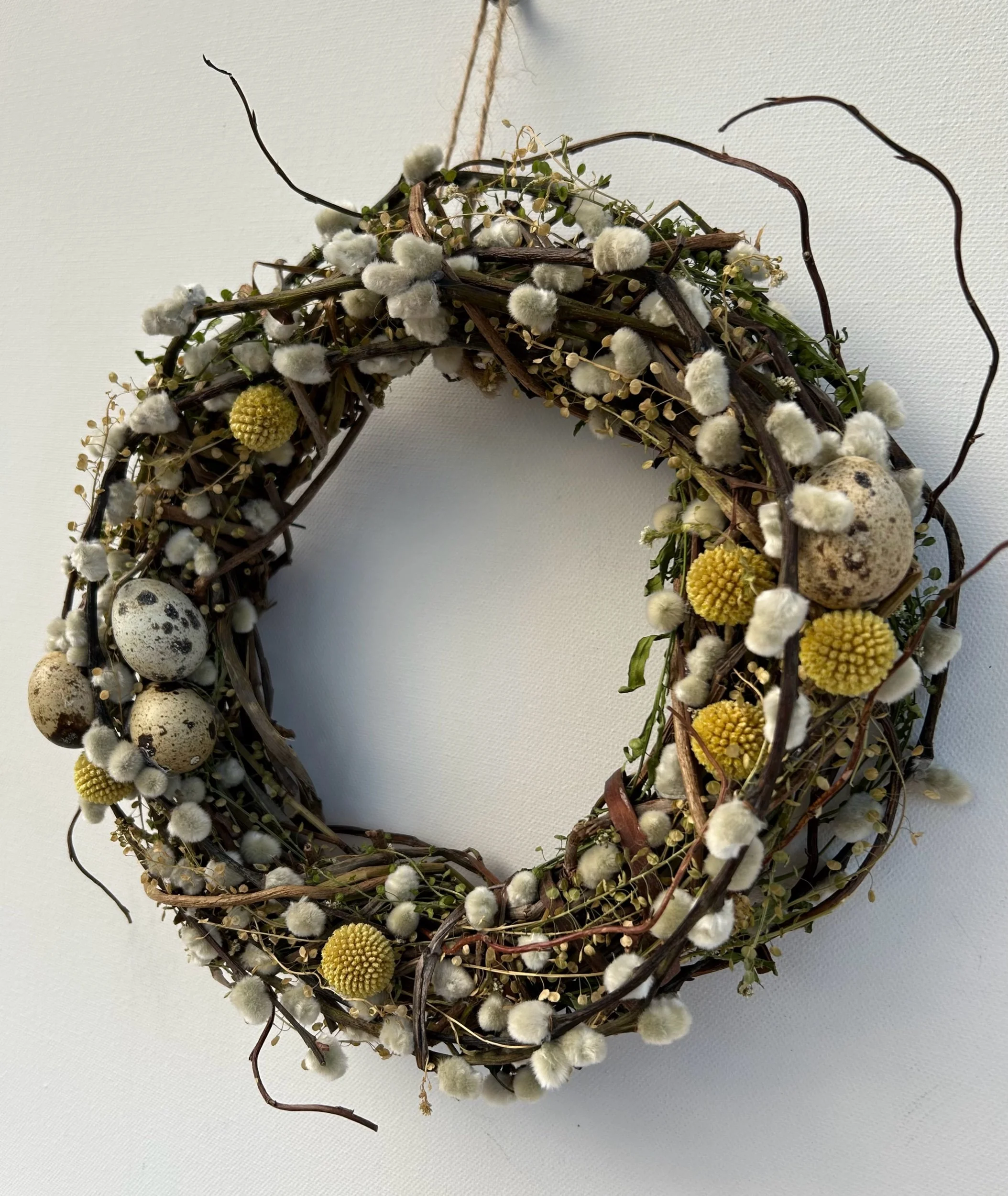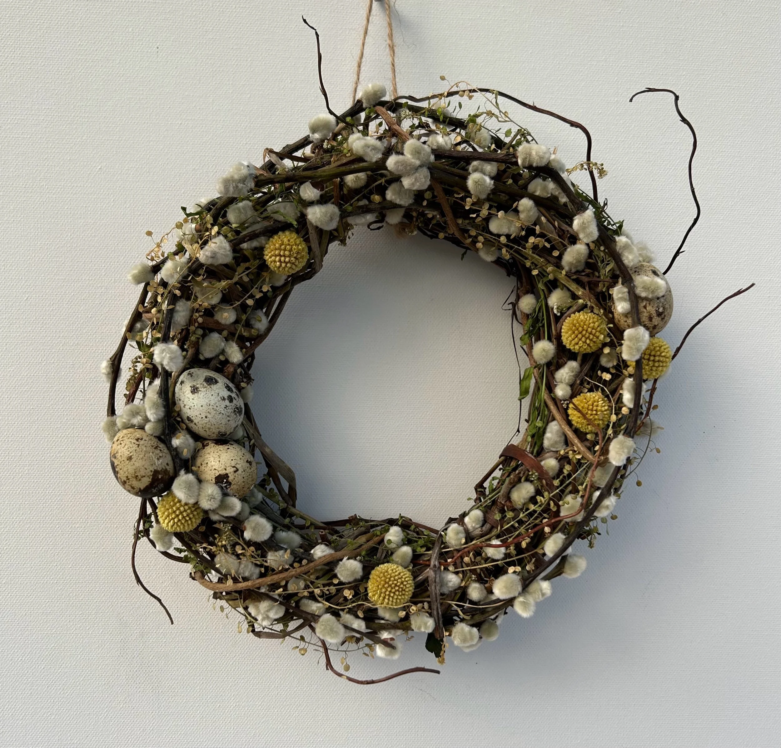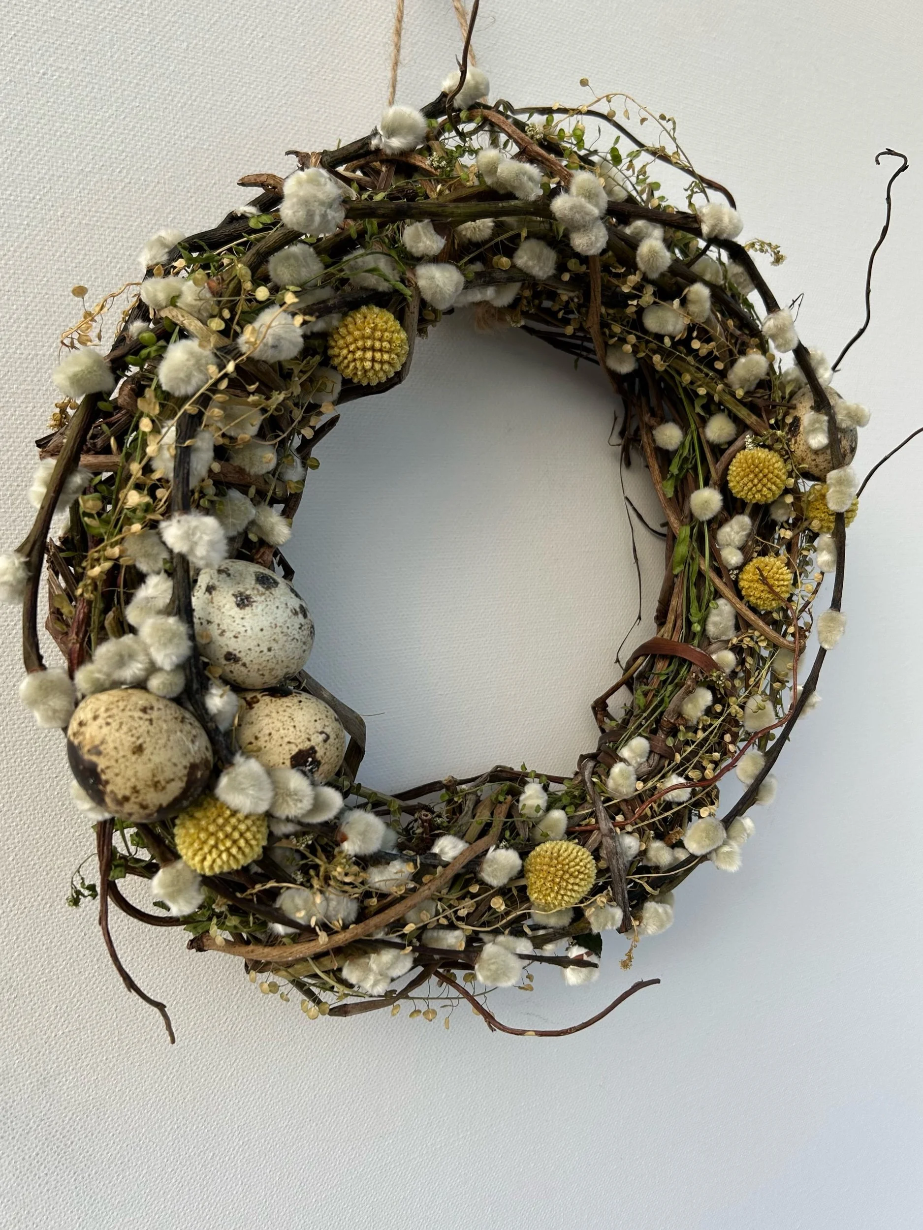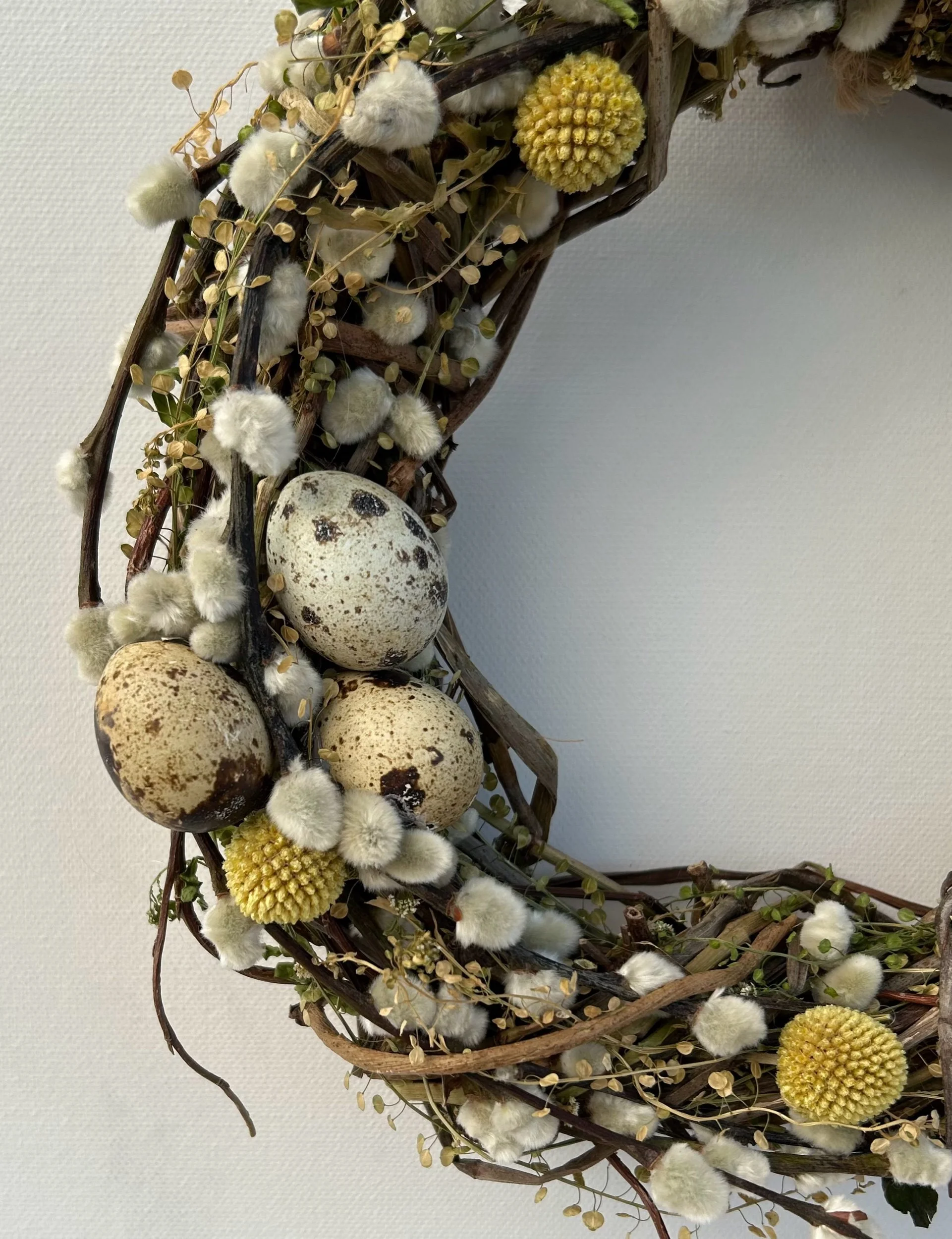 Includes Salix Snowflake (Pussy Willow), Craspedia (Billy Buttons), Thlaspi (Pennycress) and finished with blown quails eggs.